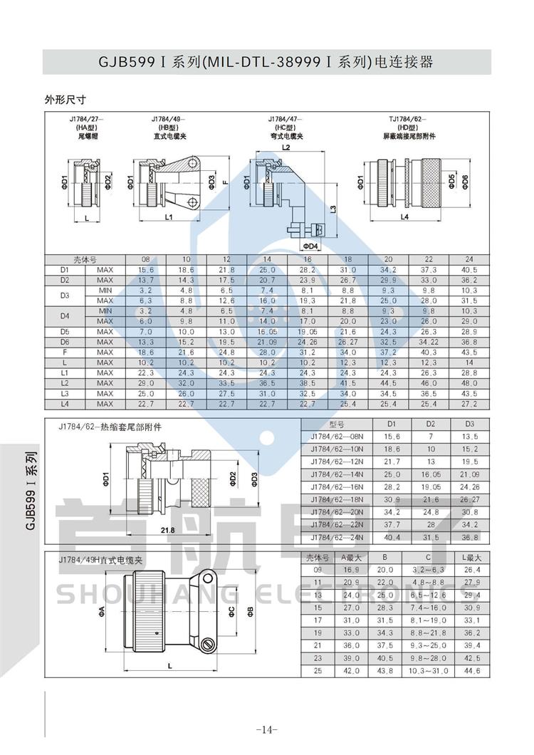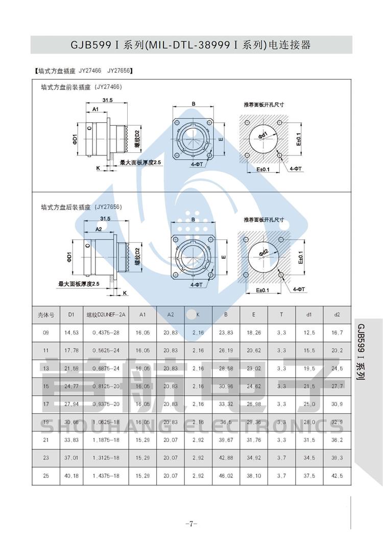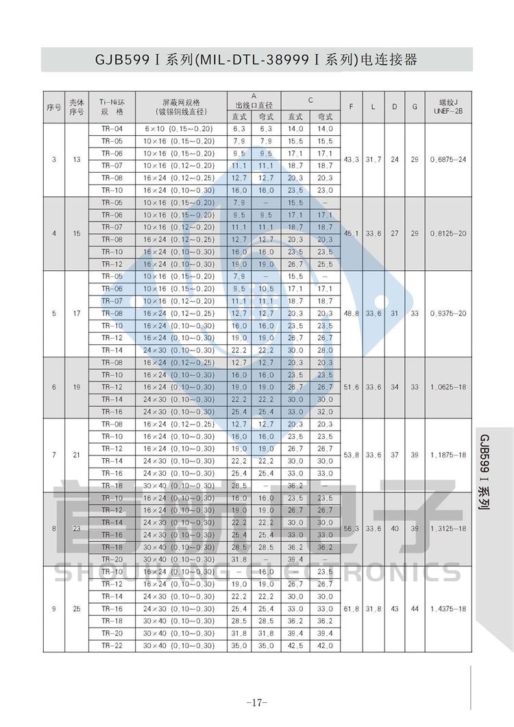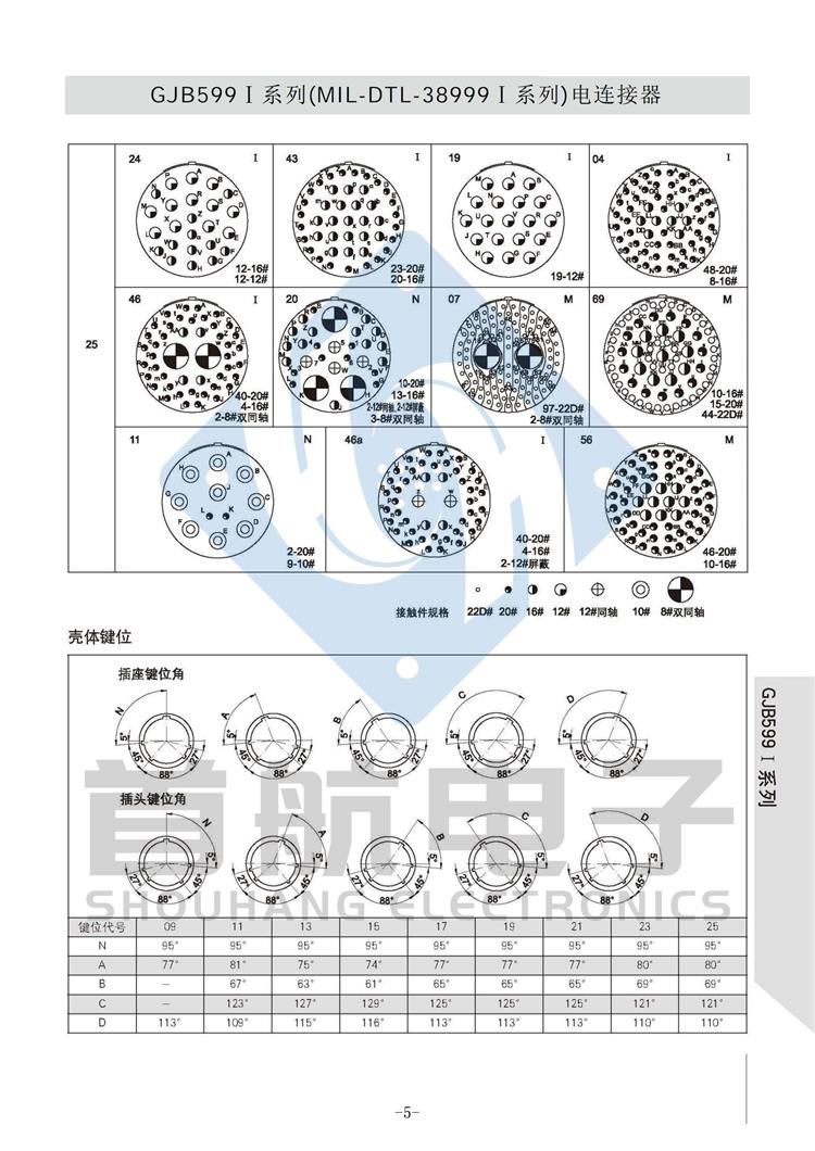 *符合GJB599A(MIL-DTL-38999K)I系列 *卡口式快速连接*体积小,重量轻,接触偶密度高 * EMI/RFI屏蔽*接触件压接可取卸,防斜插设计 *插座有盒式、墙式、前装、后装及螺母紧固式安装等多种形式 *符合GJB1784的标准尾部附件,适用于屏蔽电缆夹紧的专用尾部附件(Ti-Ni合金记忆环)*9种壳体号,70种孔组排列*插合面界面及尾部具有密封结构,三防性能优良*五键位导向机构,有五种防错插键位 *广泛应用于航空、航天及军事系统