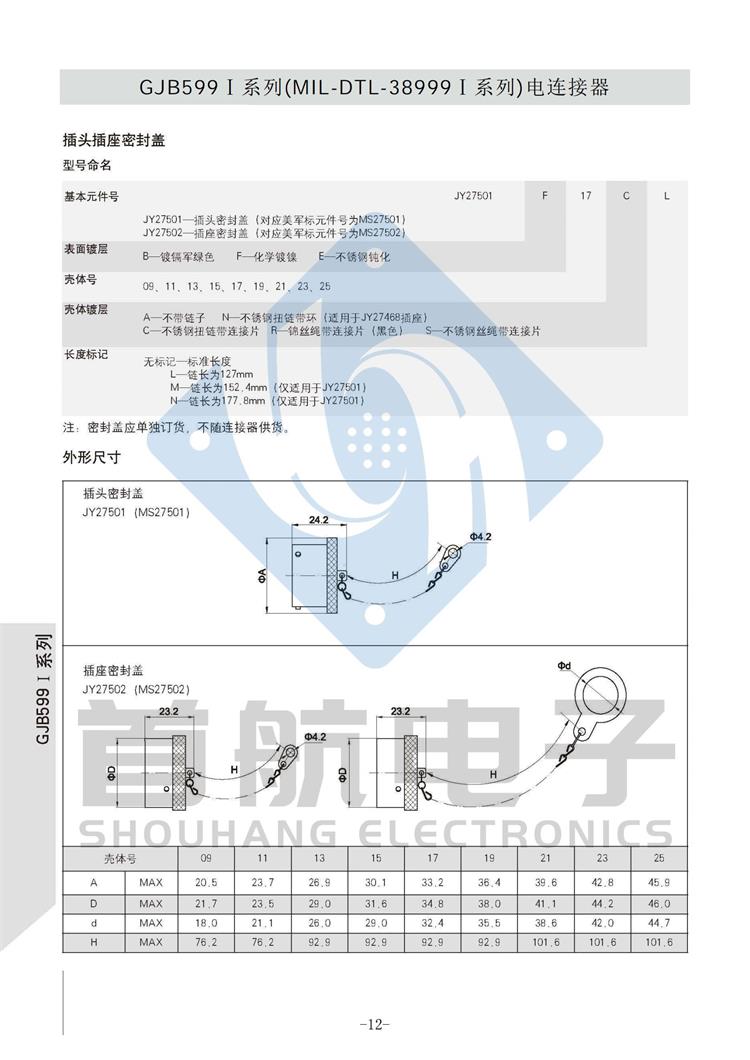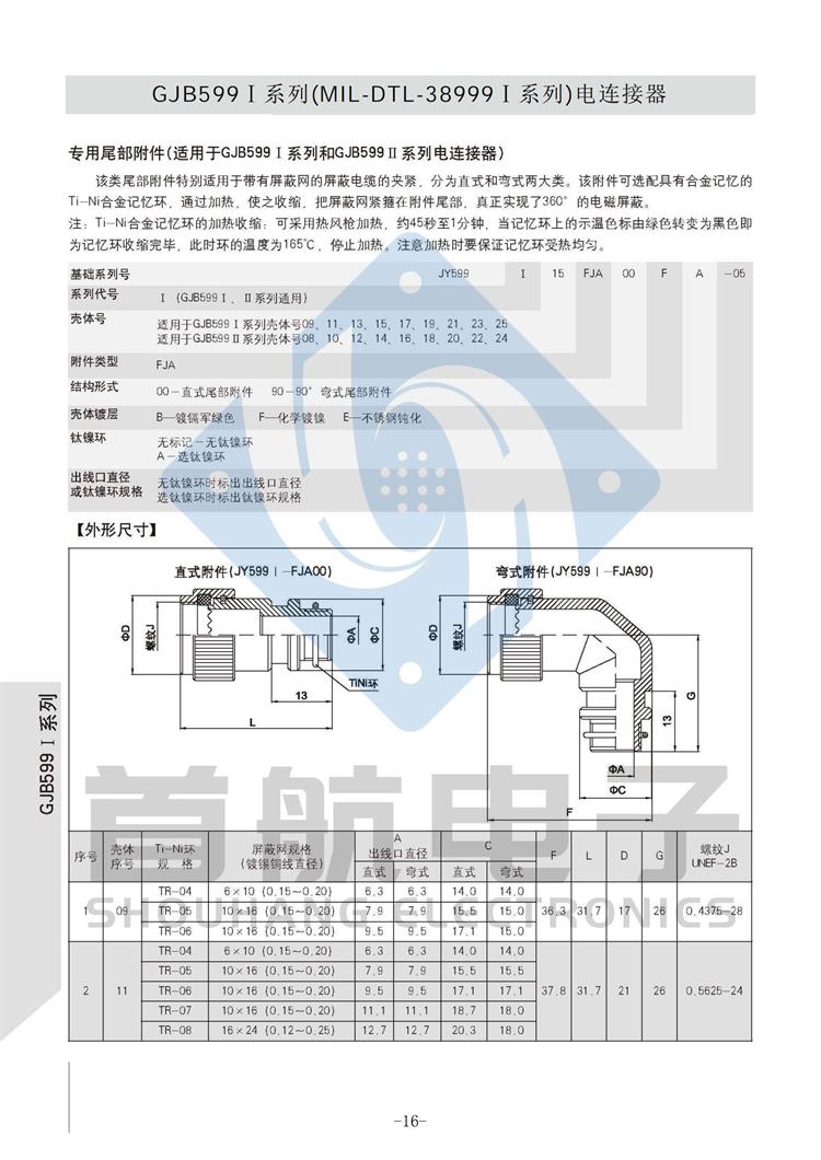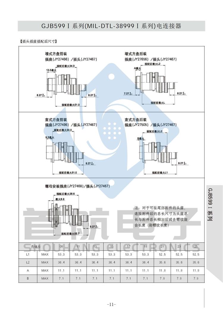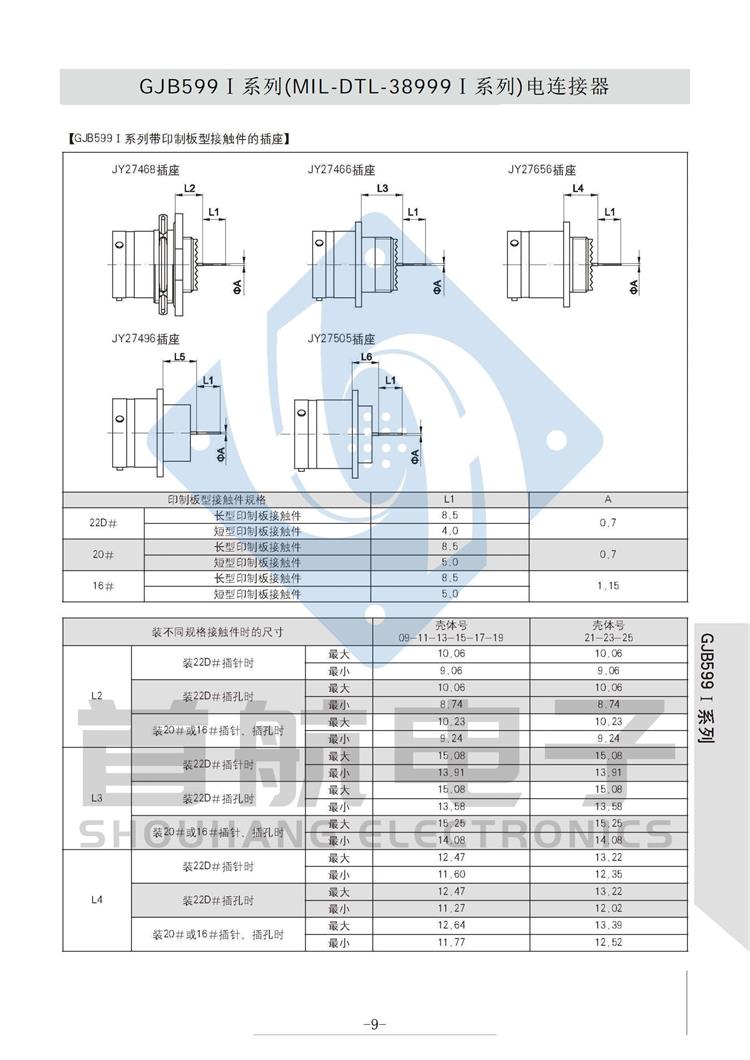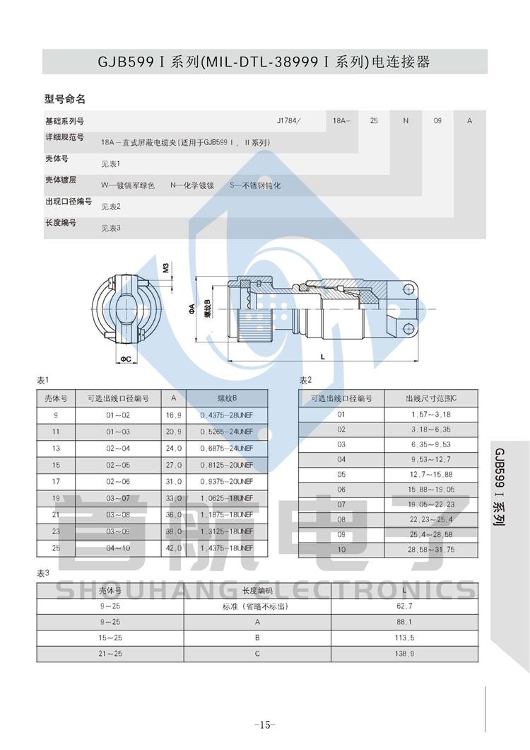 *符合GJB599A(MIL-DTL-38999K)I系列 *卡口式快速连接*体积小,重量轻,接触偶密度高 * EMI/RFI屏蔽*接触件压接可取卸,防斜插设计 *插座有盒式、墙式、前装、后装及螺母紧固式安装等多种形式 *符合GJB1784的标准尾部附件,适用于屏蔽电缆夹紧的专用尾部附件(Ti-Ni合金记忆环)*9种壳体号,70种孔组排列*插合面界面及尾部具有密封结构,三防性能优良*五键位导向机构,有五种防错插键位 *广泛应用于航空、航天及军事系统