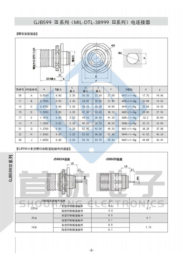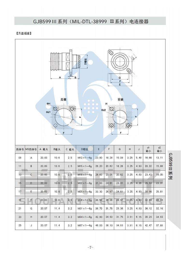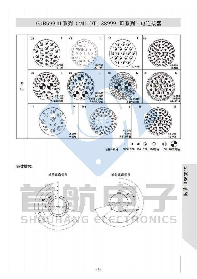 产品简介 *符合GJB599A(MIL-DTL-38999K)Ⅲ系列 *三头螺纹快速连接。并带防松脱机构 *体积小,重量轻,接触偶密度高 *具有电磁屏蔽功能 *接触件压接可取卸,防斜插设计 *具有防火壳体、复合材料壳体、铝合金壳体和多种镀层 *具有高温下的高强度振动特性,能适合在恶劣的风砂和潮湿的场合下使用
