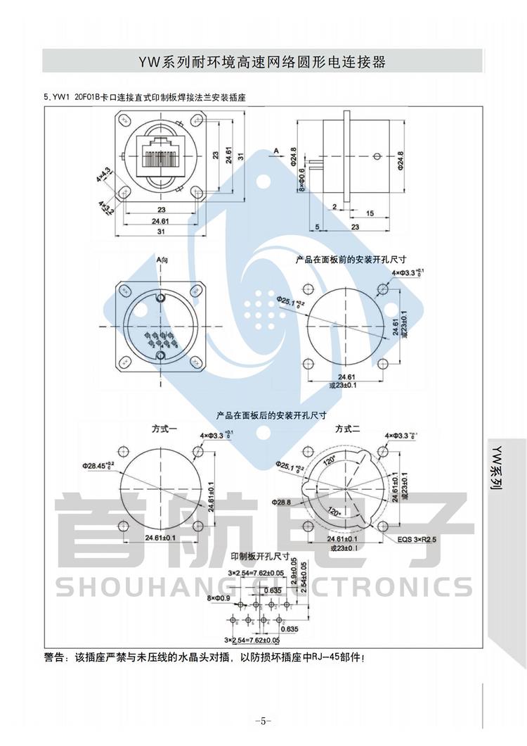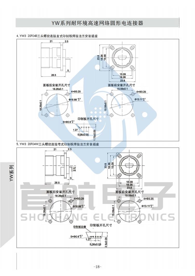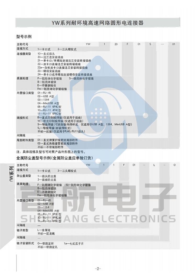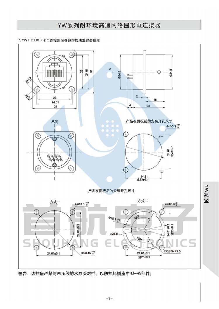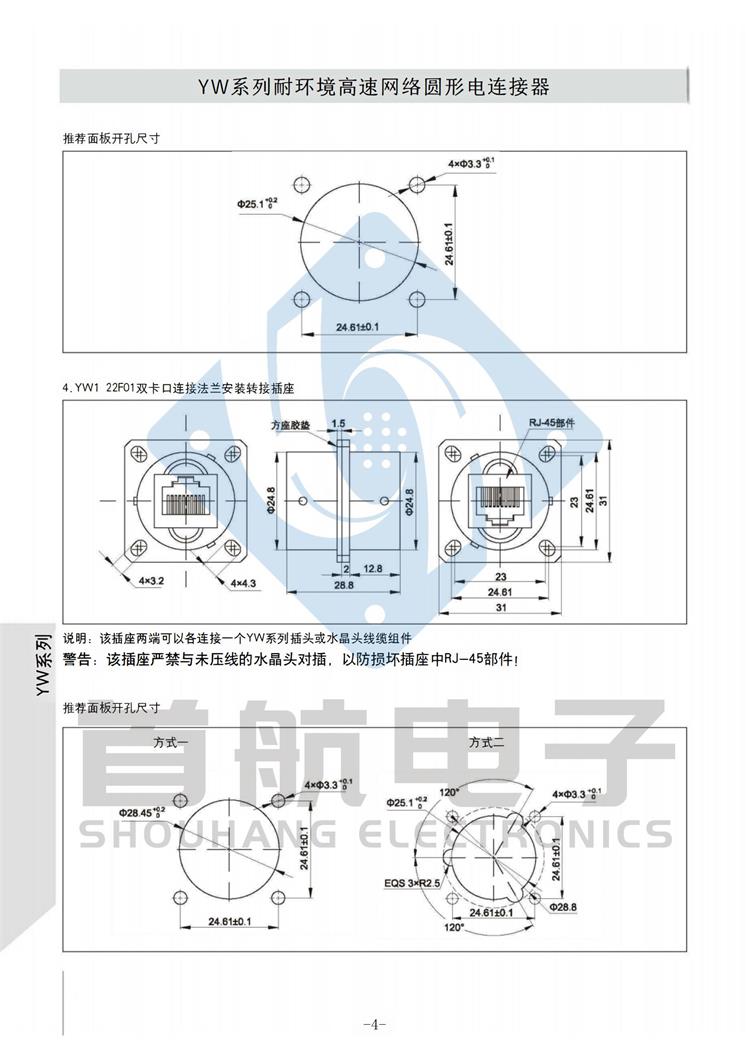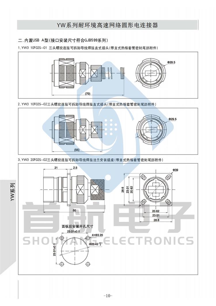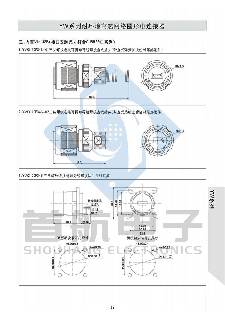 *连接方式:卡口、三头螺纹 *根据需要可内置RJ45、USB、RJ11和1394等接口 *USB有:USB A型、USB B型、MiniUSB A型4P、MiniUSB A型5P、MiniUSB A型8P、MiniUSB B型4P、MiniUSB B型5P *端接形式为导线焊接、压接和印制板焊接 *插座有端接型和转接型,转接形式为单卡口(单螺纹)和双卡口 *接口安装尺寸符合MIL-C-26482(GJB598)和GJB599的安装; *性能指标符合GJB598和TIA/EIA-568。