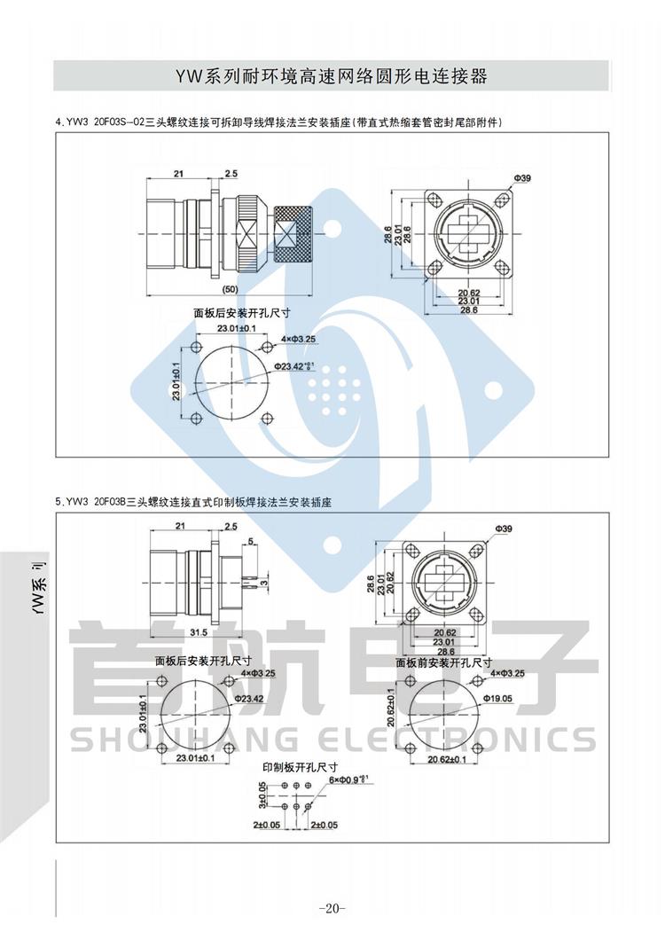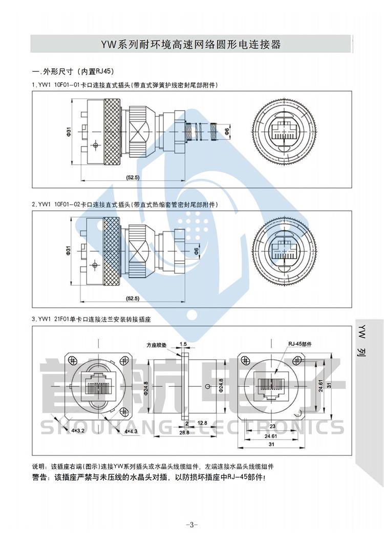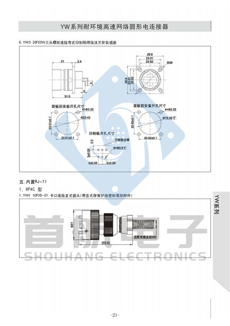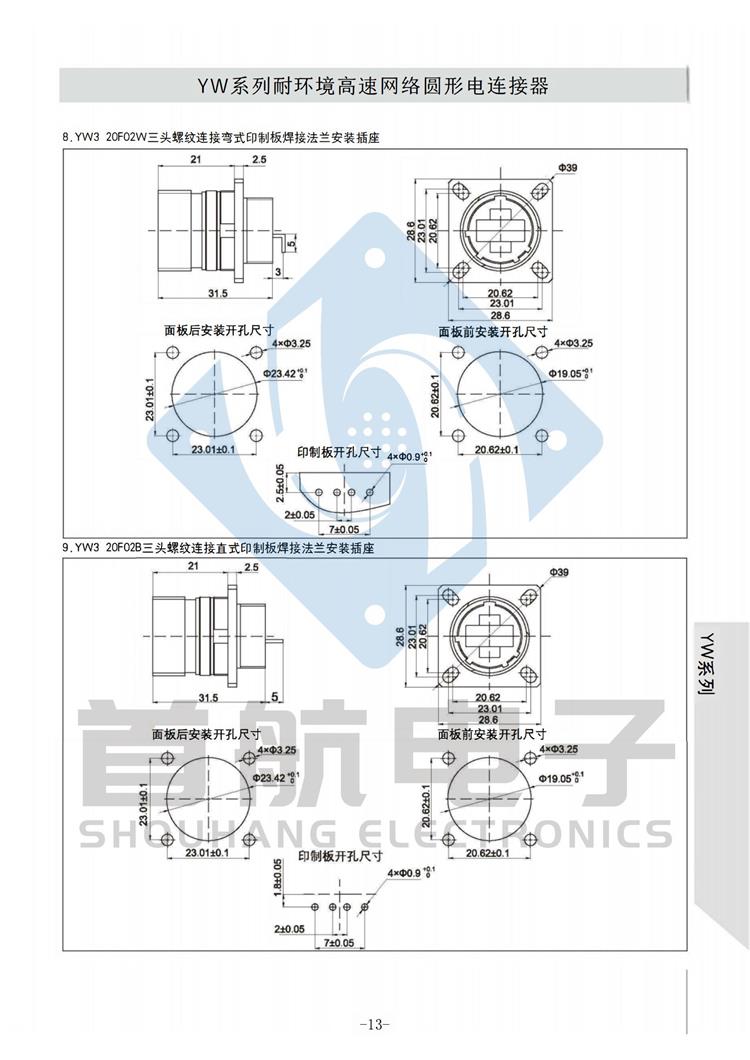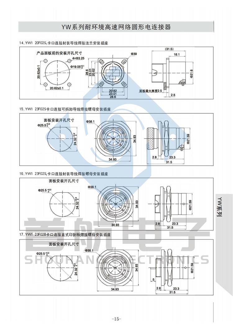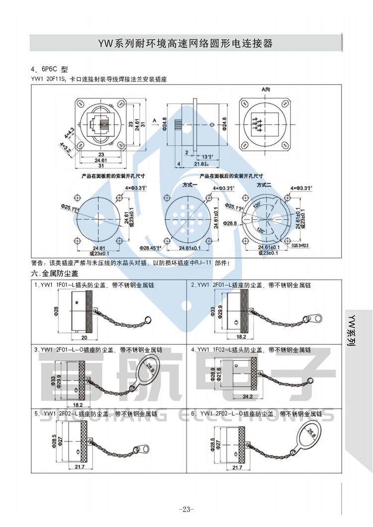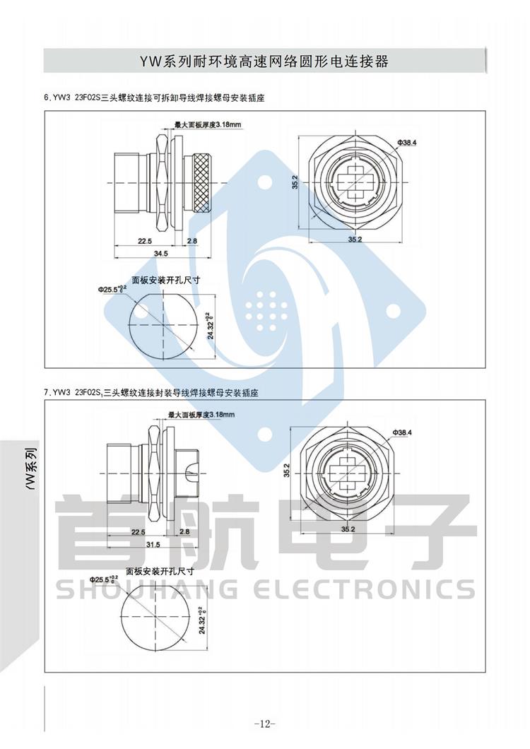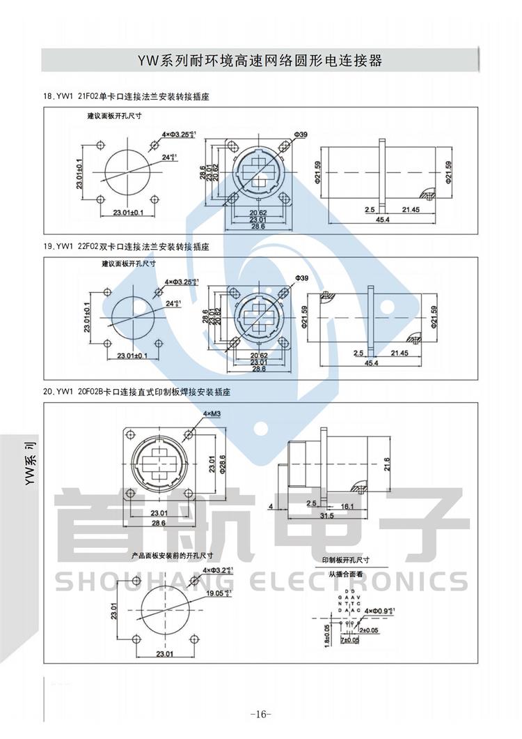 *连接方式:卡口、三头螺纹 *根据需要可内置RJ45、USB、RJ11和1394等接口 *USB有:USB A型、USB B型、MiniUSB A型4P、MiniUSB A型5P、MiniUSB A型8P、MiniUSB B型4P、MiniUSB B型5P *端接形式为导线焊接、压接和印制板焊接 *插座有端接型和转接型,转接形式为单卡口(单螺纹)和双卡口 *接口安装尺寸符合MIL-C-26482(GJB598)和GJB599的安装; *性能指标符合GJB598和TIA/EIA-568。