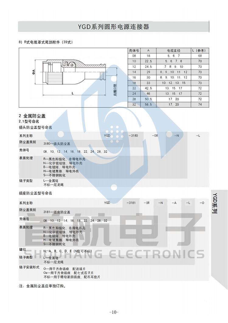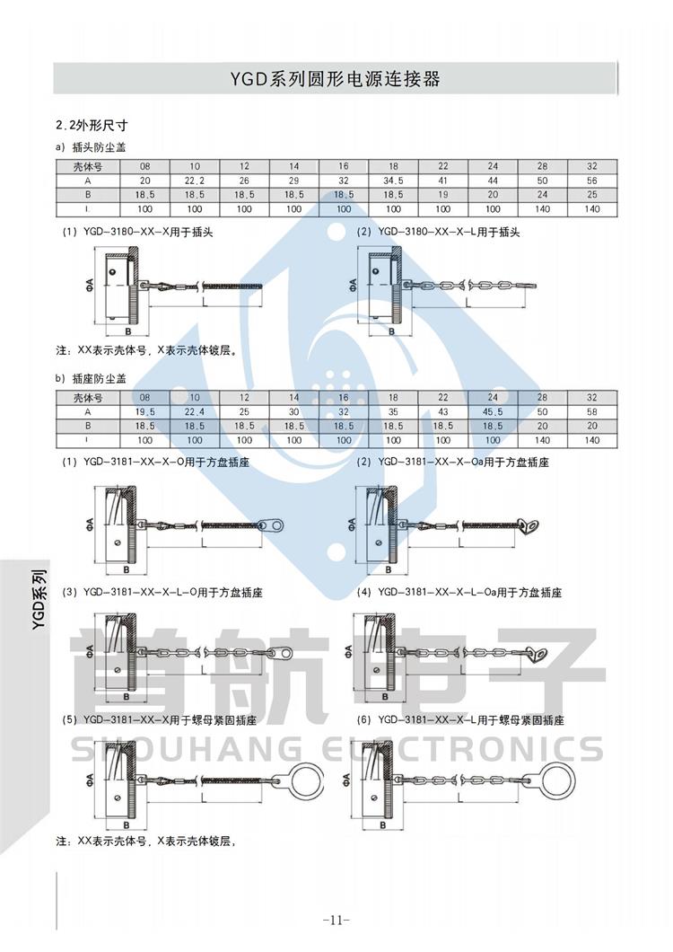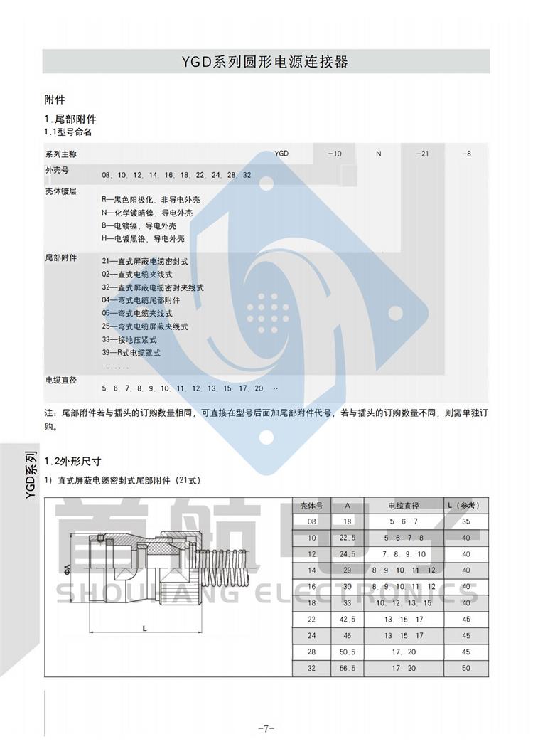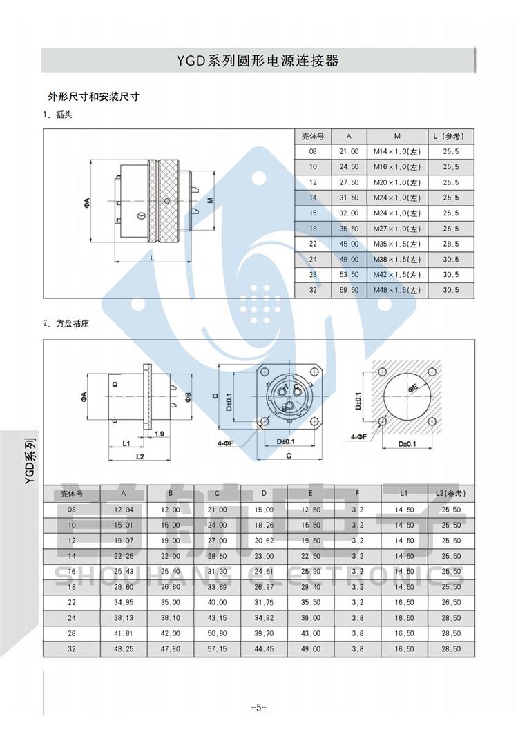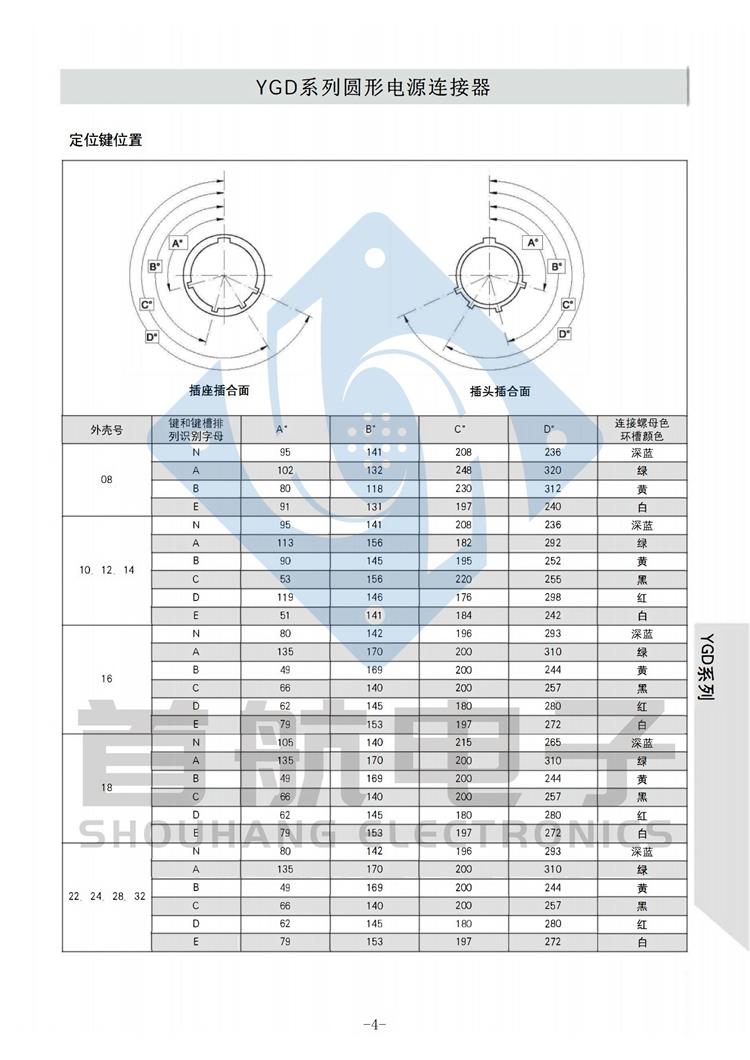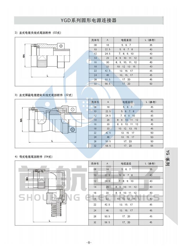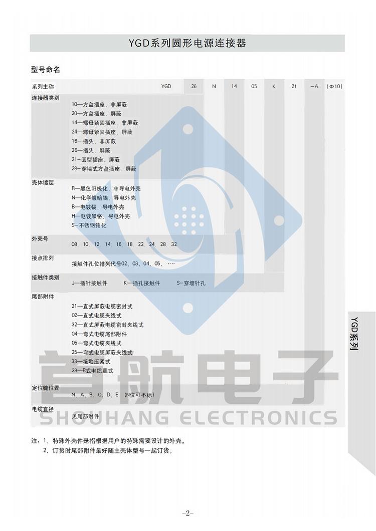 产品简介 *该系列产品符合GJB5371-2005《YGD系列圆形电源连接器通用规范》 *连接方式采用卡口连接,接触件端接形式为焊接.插孔接触件为冠簧插孔 *产品具有快速连接和分离,耐环境好,可靠性高等特点 *适用于大电流电源系列的连接 *插头有多种电缆安装形式