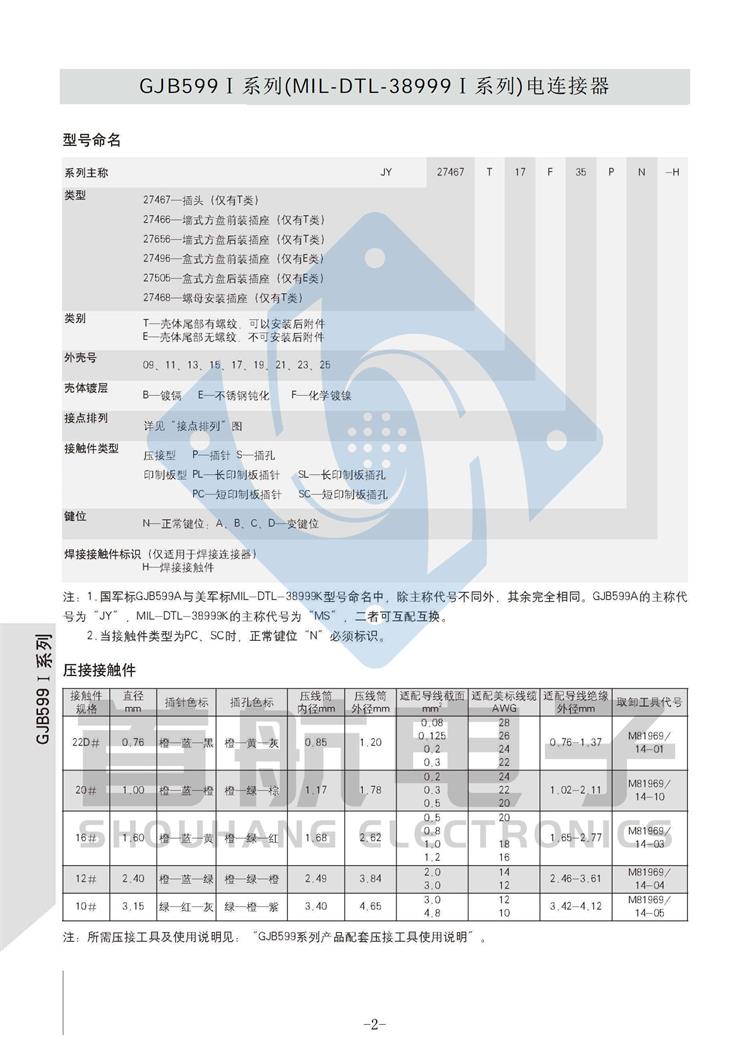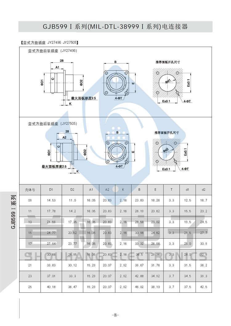 *符合GJB599A(MIL-DTL-38999K)I系列 *卡口式快速连接*体积小,重量轻,接触偶密度高 * EMI/RFI屏蔽*接触件压接可取卸,防斜插设计 *插座有盒式、墙式、前装、后装及螺母紧固式安装等多种形式 *符合GJB1784的标准尾部附件,适用于屏蔽电缆夹紧的专用尾部附件(Ti-Ni合金记忆环)*9种壳体号,70种孔组排列*插合面界面及尾部具有密封结构,三防性能优良*五键位导向机构,有五种防错插键位 *广泛应用于航空、航天及军事系统