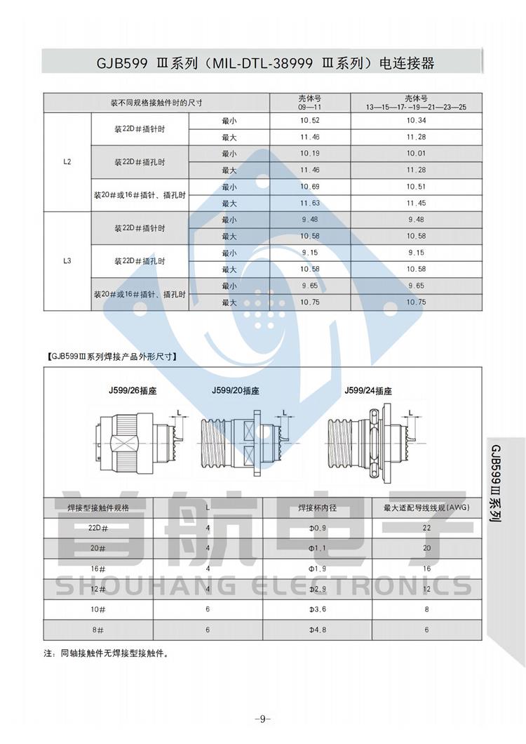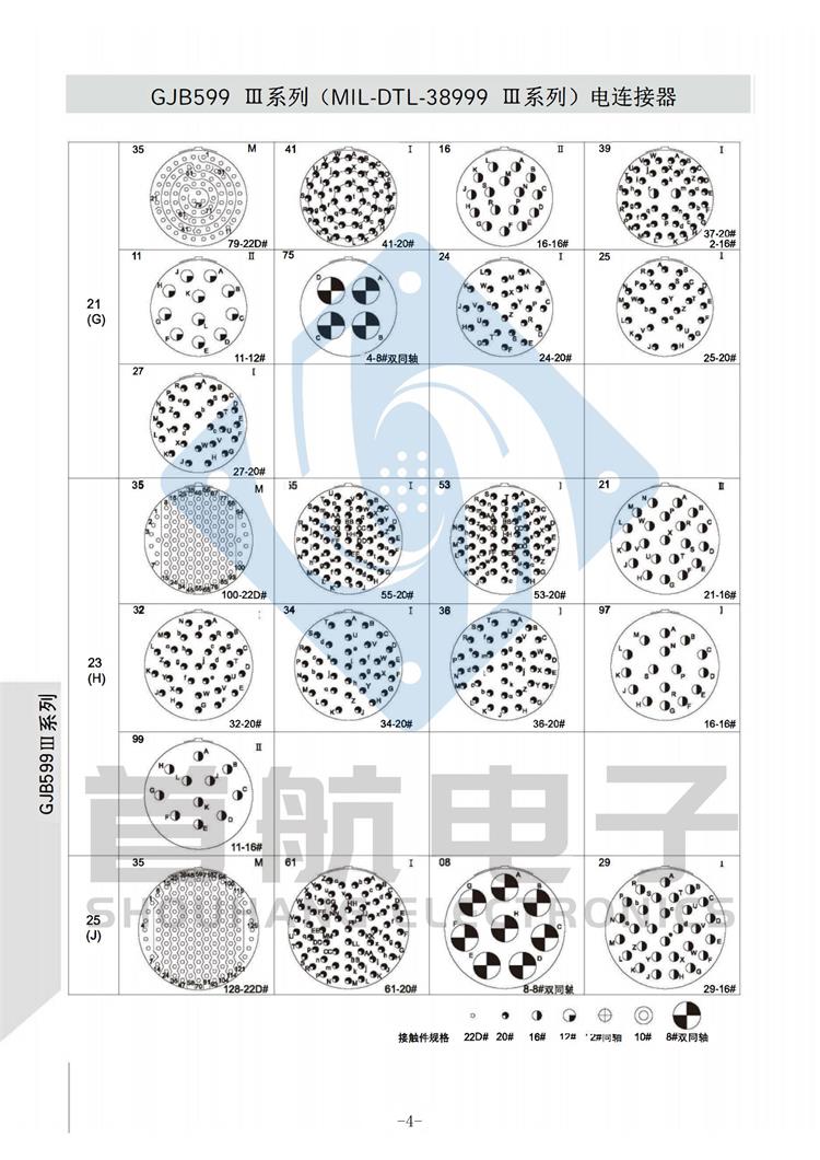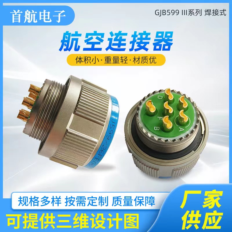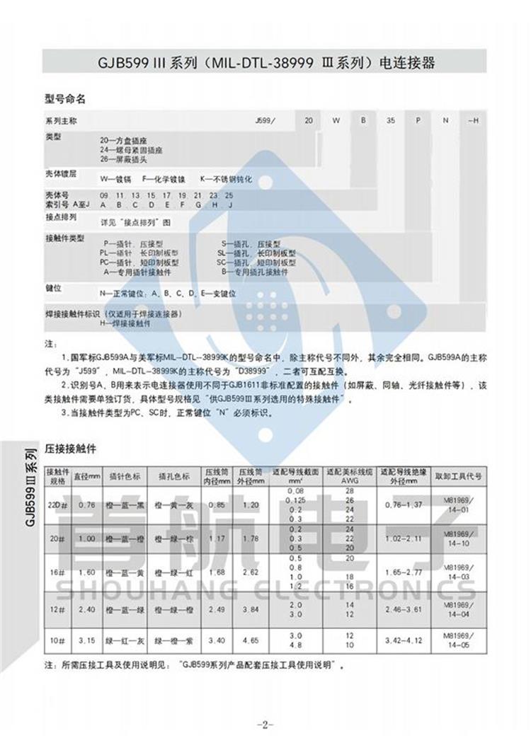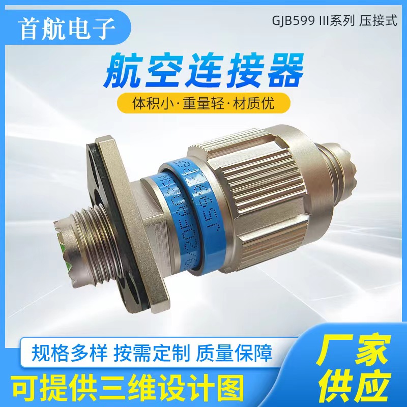 产品简介 *符合GJB599A(MIL-DTL-38999K)Ⅲ系列 *三头螺纹快速连接。并带防松脱机构 *体积小,重量轻,接触偶密度高 *具有电磁屏蔽功能 *接触件压接可取卸,防斜插设计 *具有防火壳体、复合材料壳体、铝合金壳体和多种镀层 *具有高温下的高强度振动特性,能适合在恶劣的风砂和潮湿的场合下使用