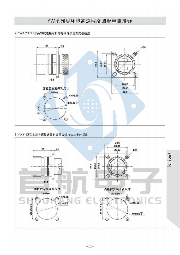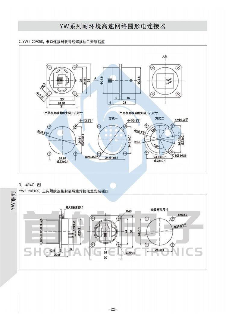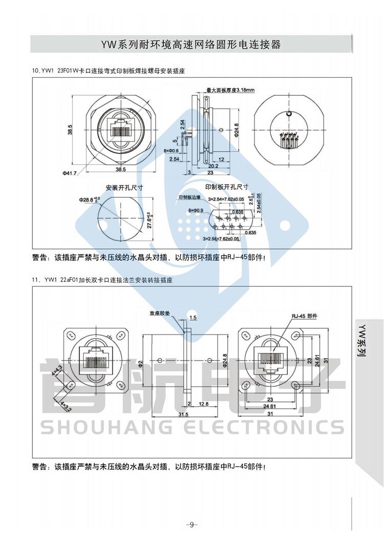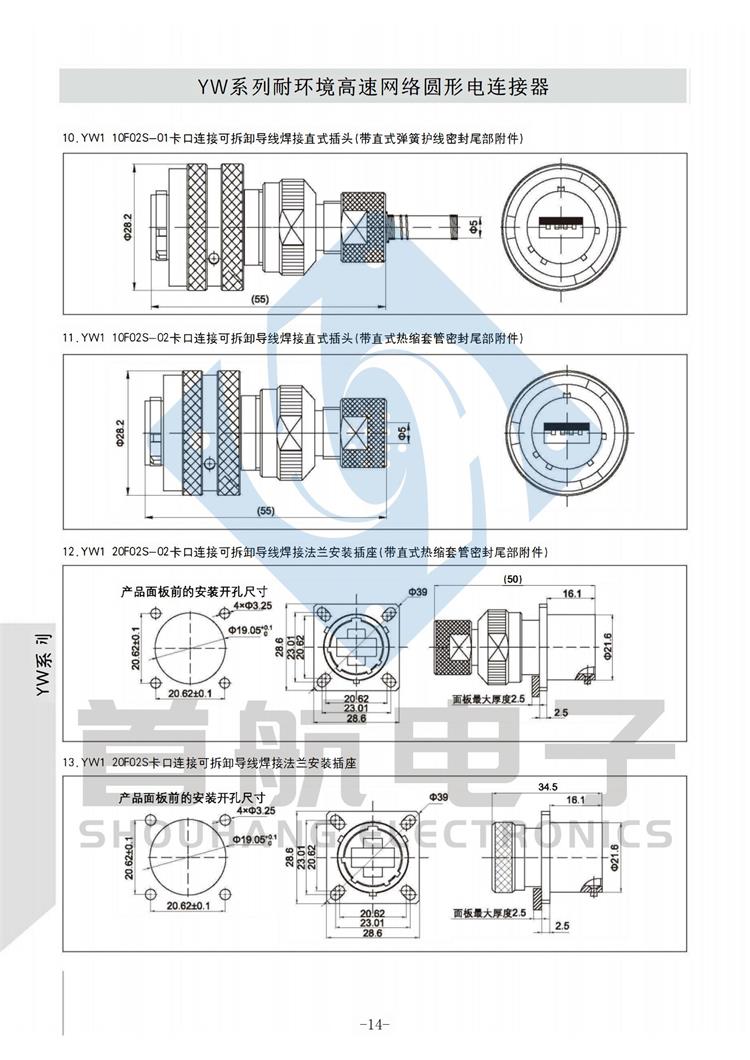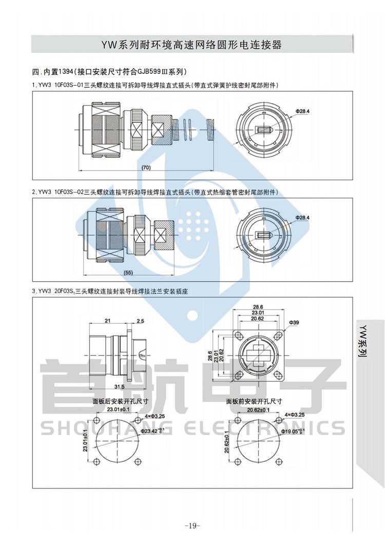 *连接方式:卡口、三头螺纹 *根据需要可内置RJ45、USB、RJ11和1394等接口 *USB有:USB A型、USB B型、MiniUSB A型4P、MiniUSB A型5P、MiniUSB A型8P、MiniUSB B型4P、MiniUSB B型5P *端接形式为导线焊接、压接和印制板焊接 *插座有端接型和转接型,转接形式为单卡口(单螺纹)和双卡口 *接口安装尺寸符合MIL-C-26482(GJB598)和GJB599的安装; *性能指标符合GJB598和TIA/EIA-568。